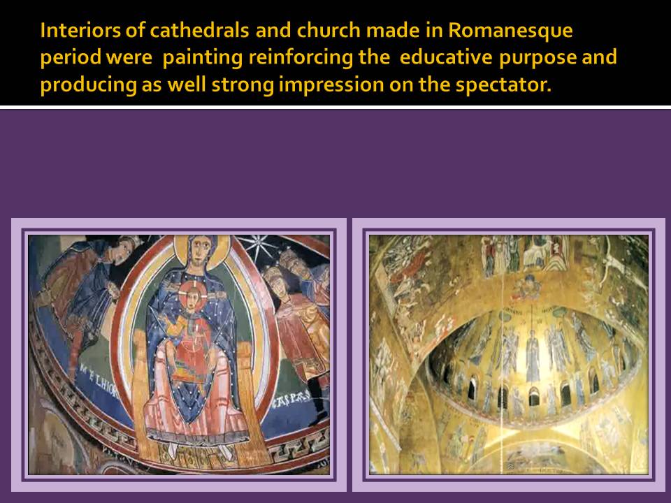 Painting in Romanesque period has a notable development, because the vast space of smooth walls were appropriate to the pictorial decoration; therefore, the painting was also a subordinated art to the architecture. The need to get a quick religious impromptu in the spectator as soon as they approach the interior of this buildings made the use of painting a valuable resource.